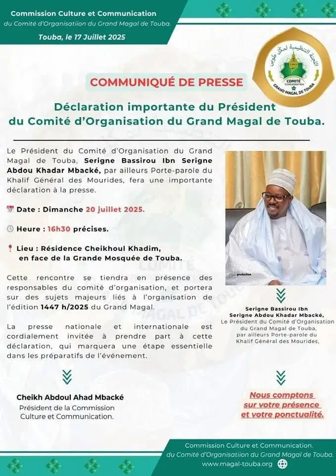 Préparatifs du Grand Magal de Touba 2026 : La première réunion décisive prévue ce mercredi 15 Avril 2026