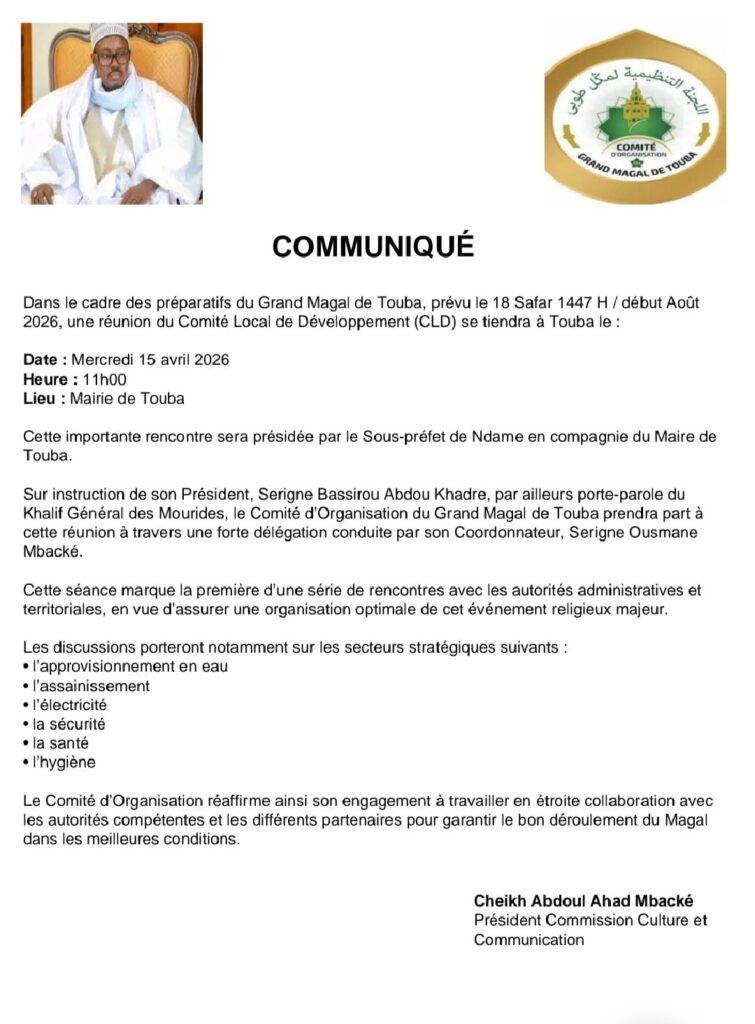 Les préparatifs du Grand Magal de Touba, prévu le 18 Safar 1448 H/début août 2026, seront officiellement lancés demain. Une première réunion du comité local de développement (CLD) se tiendra ce mercredi 15 avril 2026 à 11 heures à la mairie de Touba, sous la présidence du sous-préfet de Ndame en compagnie du maire de Touba, a appris Seneweb de Serigne Cheikh Abdoul Lahad Mbacké Gaïndé Fatma.